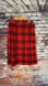 A classic red & navy tartan plaid skirt featuring the traditional safety pin detail. It’s knee length, wrap style with fringe detailing at the side. Completed pleated in the back.