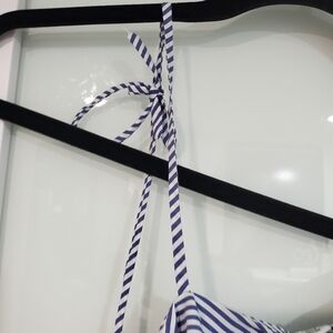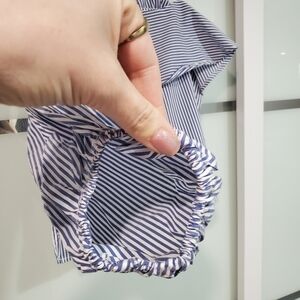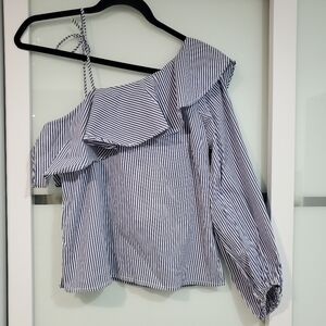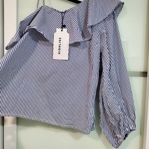 New on tags top from Highline Collective in blue and white stripes. One long sleeve and a cute tie for the other side. Ruffle detail. Zipper on the side. Perfect for the upcoming season.