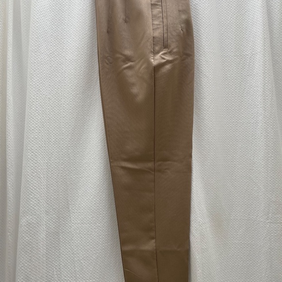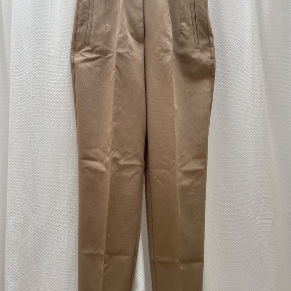 High waisted pants with pronounced seams at front and back. Front welt pockets. Front zip, metal hook, and inside button closure.