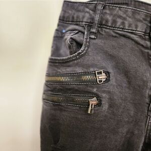 Very distressed highwaisted black jean jeggings with 4 diagonal zipper front pockets, by Garage.