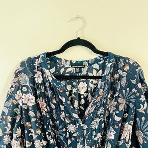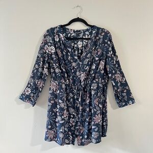 Hilary Radley navy blue women's long sleeve top with a floral design. The style is a baby doll tunic like with a tie at the waist to synch and give more of an hourglass look. Pleated chest with buttons along the front. Buttons on arm sleeve aswell so that you can wear it quarter sleeve or synch it up shorter.