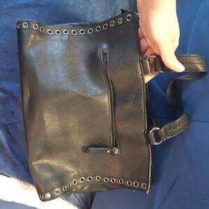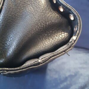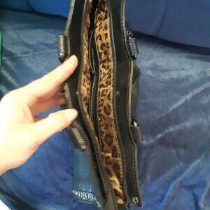 Beautiful large black bag with decorative eyelets, chic look and very practical with its 3 compartments. It's in impeccable condition with a few signs of wear (see photos). The leopard print lining is in perfect condition. Make me an offer!