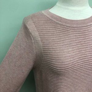 Sweater is blush pink in colour with white blouse-like trim at bottom