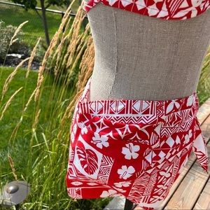 Vibrant red bikini and sarong with white patterns. Perfect for beachwear. Lightweight and stylish, 100%cotton with an acetate lining.