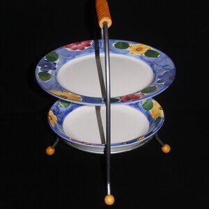 This 2 tiered stand has a bowl in the lower tier and a plate in the top tier, giving you the convenience and flexibility of using the plate for other foods besides fruit, such as croissants, muffins, Danish, cake, etc.