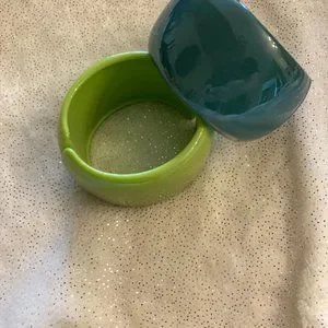 2 - hinged cuff bracelets 1 green and 1 teal Will fit up to 7.5" wrist comfortably