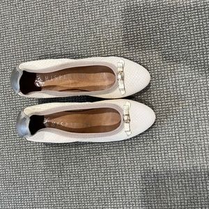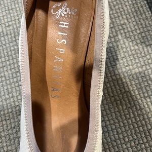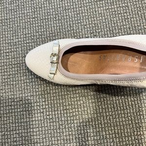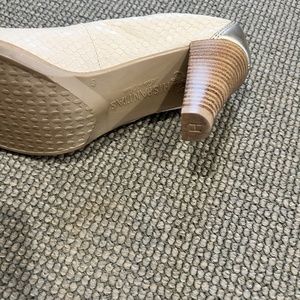 Tan color, silver on the back, bow on the front, Classic and comfortable- please see all pictures.