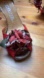 These are in like new condition. The bow is made of cloth and adds interesting detail to the woven patterned red shoe.