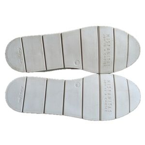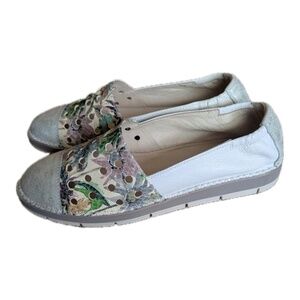 Hispanitas white flat, leather upper with perforated floral (blue, purple, coral, green etc) and silver toe cap and heel. white rubber sole with grey detail at the side. cushioned insole with elastic at the heel for good fit. size 38 or US 7.5. these are like new, clean inside and out with very minimal sign of wear on the bottom. made in spain.
