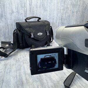 Tested and working. Can not confirm the battery life but it charges with the cable and turned on after a few days of sitting dormant. Comes with used tape, rca cables, remote, charging cable and carry case. Please see the pictures and let me know if you have any questions. Canadian seller, thanks for looking!