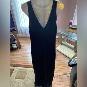 Sleeveless, calf-length dress in a fine rib knit with shaping sections. Low-cut V-neck front and back and a high slit at one side of hem with buttons.