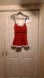 Festive red camisole with white fur trim. Features black straps and a decorative belt detail perfect for a festive costume or a night of naughty , fun dress or lingerie , you choose