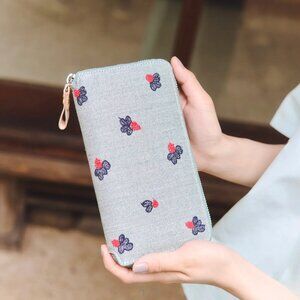 The zipper pull is made from natural leather and includes a butterfly charm.