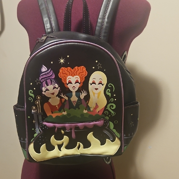 Stylish black mini backpack featuring the Sanderson sisters across the front. Binx on one side and Billy on the other, and the back says "I Put a Spell on you". Perfect for adding a fun touch to your outfit.