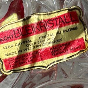 This lead crystal candy dish combines artistry and functionality with its intricate red etched bird design. Handmade in Western Germany, it showcases exceptional craftsmanship and durability.