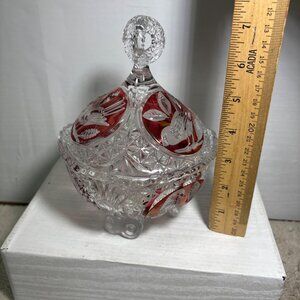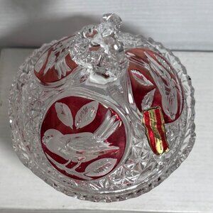 Hofbauer Byrdes Crystal Candy Dish With Lid Red Etched Bird Design 7" Tall