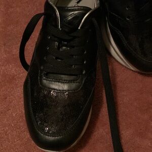 Hogan Black Sequin Runners with silver detail on the wedge and collar.