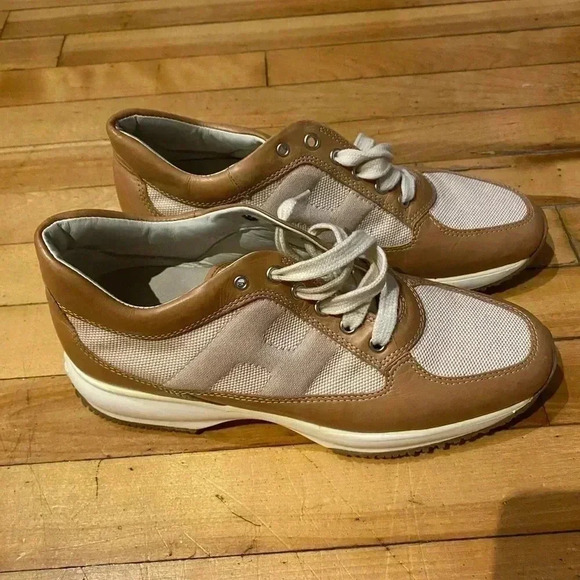 Elegant sneakers with tan leather and white mesh. Lace-up style. Perfect for casual wear.