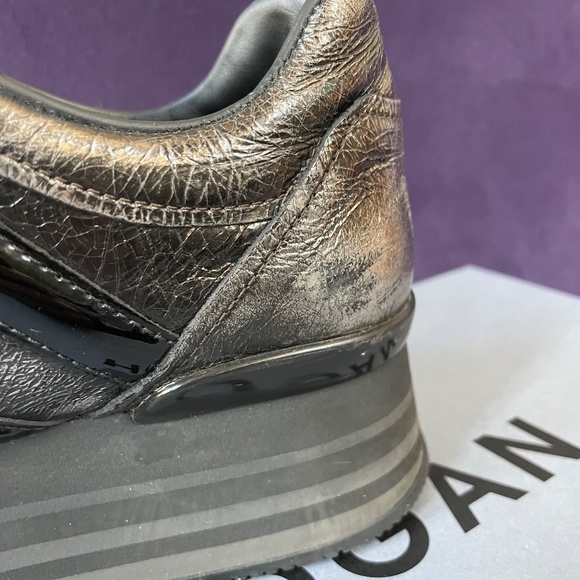 Great condition. Some wear on instep and heel but otherwise in great condition. Colour is like dark grey/platinum with a shiny, distressed finish. Great for adding some height. Size 38, fits true.