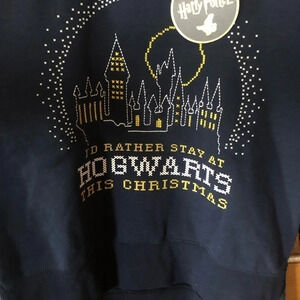 Navy with yellow and white graphic, yellow embroidery detail. Saying on the front is: I’d rather stay at Hogwarts this Christmas.