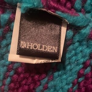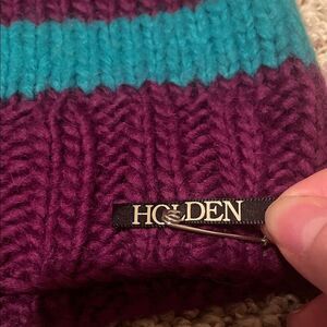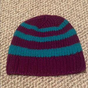 Chic knit beanie with plum and teal stripes. Perfect for cozy style.