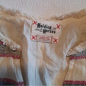 Holding Horses Anthropologie striped lined shift dress women's size 4 mini fringe, red, blue and off white/light tan woven fabric, side zipper with hook n eye closure, EUC