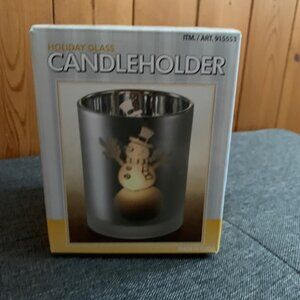 Holiday Glass Snowman Candleholder, can be used with a tea light or votive candle, (candle not included) in orginal box, 3" x 3.5" In orginal box.