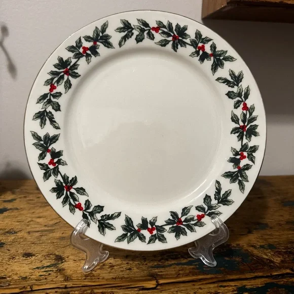 Celebrate the season with this charming plate featuring a festive holly pattern. The vibrant red berries and lush green leaves add a touch of holiday cheer to your table setting. 7.5” round!