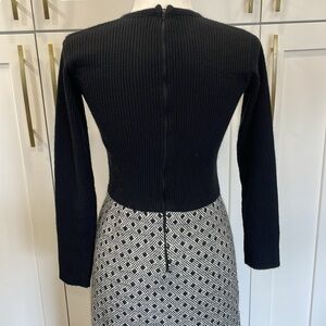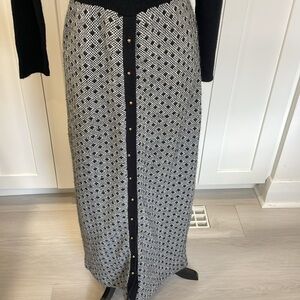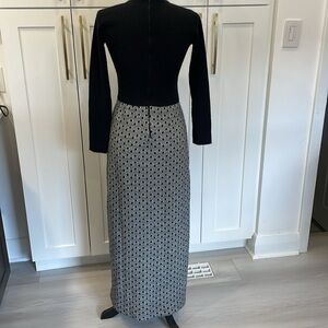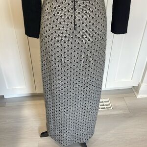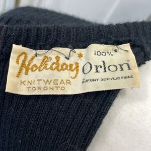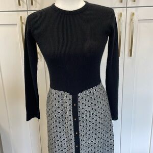 Vintage Holiday Knitwear Toronto full length sweater dress. Solid black top portion and black and white patterned skirt portion with brass toned buttons down the front. The buttons can open except for the top two, back zipper closure. No size tag but fits about a size 6 (size 6 is the mannequin size for reference). Good vintage condition with some stretching/pulling of the threading on the sides at the waist not a hole (Photos). 100% Orlon, DuPont acrylic fibre. Please see photos, measurements are for reference only. Reasonable