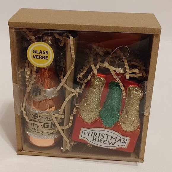 Holiday Wine and Beer Bottle Glass Ornaments NIP 2 pack