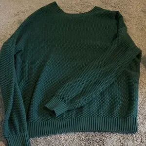 Classic women's cable knit sweater in dark green. Soft, textured knit with braided cable and seed-stitch details. Comfortable crew neckline and ribbed cuffs and hem. Easy to layer for everyday wear.