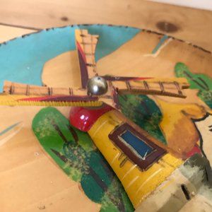 Wooden 3D wall hanging "Tulpen uit Amsterdam" #5152 from Holland has classic Dutch girl village scene. Note that the windmill is damaged - one of the "blades" is broken. There is a music box mechanism within the wall hanging, however, it will only play if the windmill blades are very gently manually turned -- it does not play on it's own. The mechanism could be accessed by taking off the backing of the wall hanging (held in place with 4 nails). Sold as/is. 8" across x 3" thick.