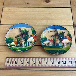 Wooden 3D wall hanging plates from Holland with hand painted village scenes with windmills that have plastic blades. One says "Amsterdam" and the other says "Rotterdam". Note that the Rotterdam pieces has a green "platform", and it looks like something may have been glued on at one point. Approx. 5 1/2" across x 1" thick. Pre-owned vintage: Rotterdam wall hanging appears to be missing a decoration that was glued onto the wood platform. Some surface wear from display/storage.