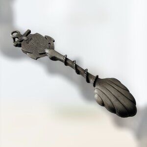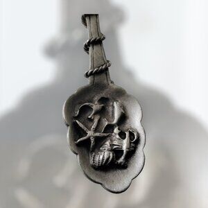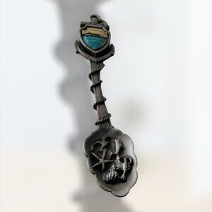 This is a great souvenir pewter spoon from Holland-America Line Cruise Ships celebrating the MS Veendam. It is 3.75 inches long. The finial has an an acrylic blue and yellow image of the ship on the sea. The bowl his embossed items including starfish, seagull, crab, whale. It is in perfect condition - made by Fort.