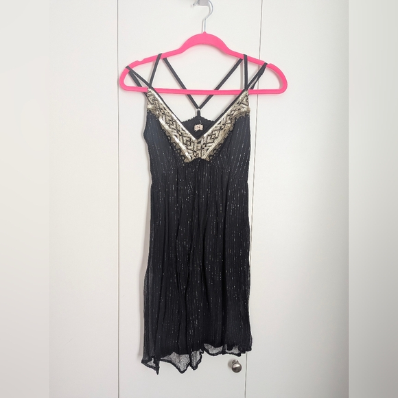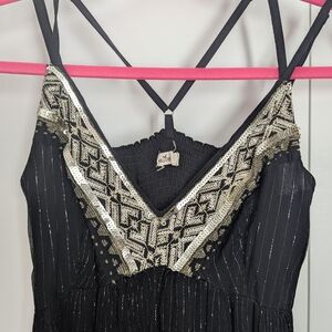 Mini dress with intricate gold detailing. Strappy design - adjustable straps.