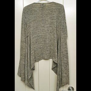 Excellent used condition. Lightweight and stretchy. Long and drapey look in the front. Heathered black and white, appears grey.
