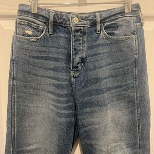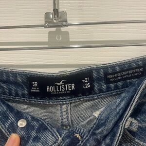 These Hollister jeans feature a medium to light blue wash with a vintage-inspired look. Designed with a straight-leg cut, they offer a high-waisted fit and a cropped length for a modern style. Perfect for casual outings, these jeans combine comfort with a timeless aesthetic.