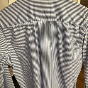Hollister Collared Shirt - White with Light Blue stripes. Size Medium. Made in Vietnam. 100% Cotton.