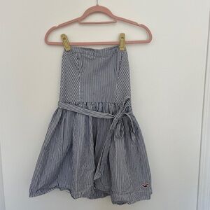 This timeless Hollister strapless dress features a crisp blue and white pinstripe, a smocked back for a comfy and secure fit, and a removable sash belt to cinch the waist. Fully lined with a lightweight cotton shell, this fit & flare silhouette is perfect for summer picnics, beach days, or casual weekend outings. Preppy, playful, and easy to style with sneakers or sandals.