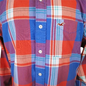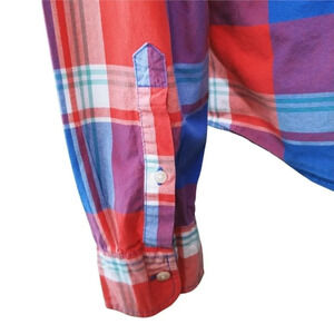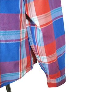 Red and blue plaid button casual/work shirt. Collared. Front pocket.