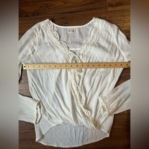 Hollister cream long sleeve wrap style long sleeve blouse with lace details and balloon sleeves.