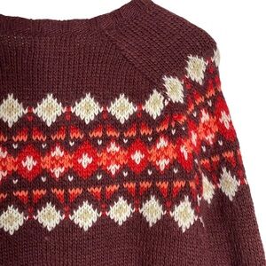 Features: knit sweater, raglan sleeves, crew neck, yoke, ribbed hem, ribbed cuffs, maroon, white, orange, red, brown, winter, warm, cottage core, retro, casual, fall, autumn, winter