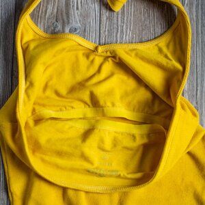This medium Hollister bodysuit is 95% cotton w/ 5% elastane, originally purchased white, dyed naturally with Osage creating this beautiful bright and vibrant shade of yellow.
