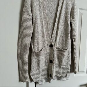 Soft knit cardigan with ribbed sleeves. Features front pockets and button closure.