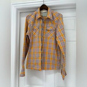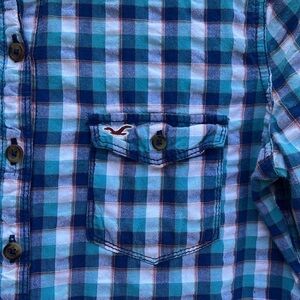 Plaid button down by Hollister. Seersucker material, lightweight, blue, teal and orange plaid, 1 chest pocket with flap. Straight through body. No marks or damage to note.