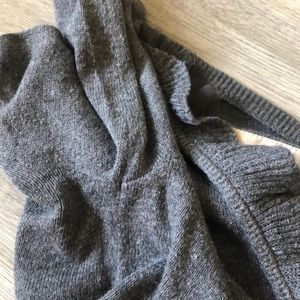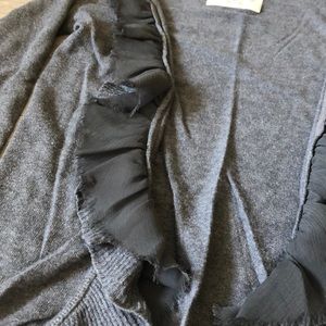 Gray cardigan with distressed chiffon ruffles along the edges. In preloved condition with mild pilling under the arms, on the sleeves, and on the lower back. Not really noticeable when worn as it blends in with the knit material. No other flaws.