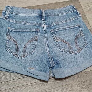 These are Hollister women’s high-rise denim shorts, made with stretch fabric for comfort. The shorts are a light blue wash with a slightly faded look. They feature: