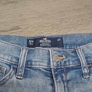 Front side: Belt loops, a metal button closure with Hollister branding, and a zipper fly.