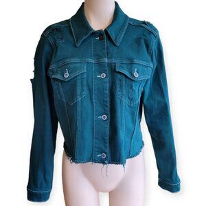 Stylish teal jean jacket. Features button closure. Perfect for casual wear.