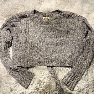 This is a cropped grey sweater with a tie in the back. You can wear this sweater with jeans, shorts, or skirts. Its super cute and super soft!